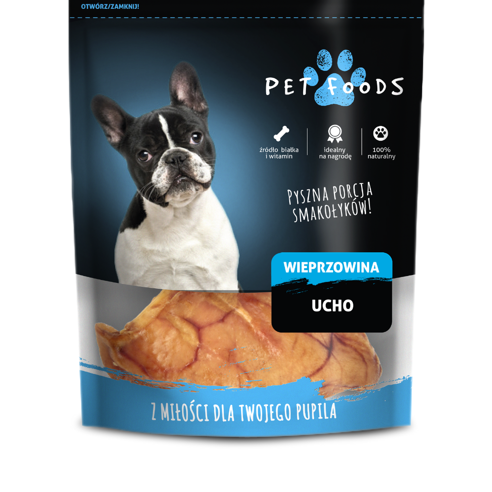 Ucho wieprzowe naturalne – gryzak naturalny, bogaty w kolagen. Ucho wieprzowe cieszy się niezmienną popularnością wśród psów wszystkich ras. Zapewni długą przyjemność żucia i gryzienia. Bez konserwantów, zdrowe, smaczne, wspomaga układ trawienny, masuje dziąsła i redukuje osad nazębny.